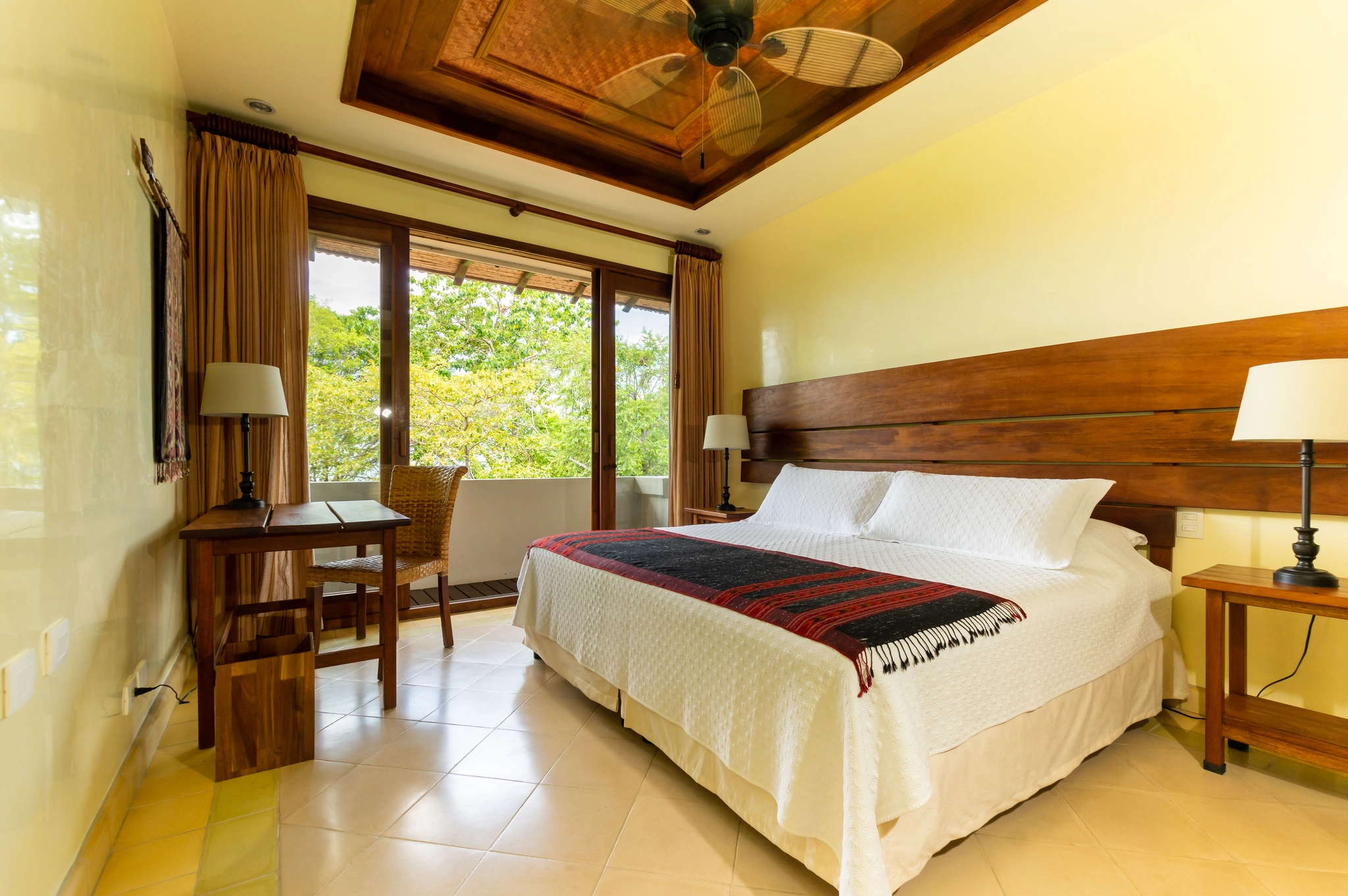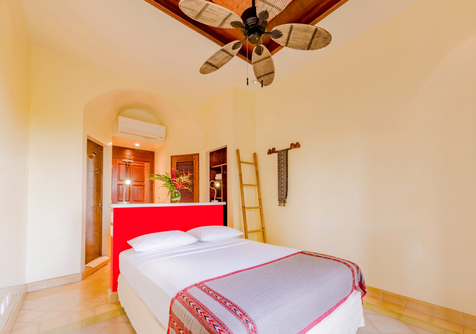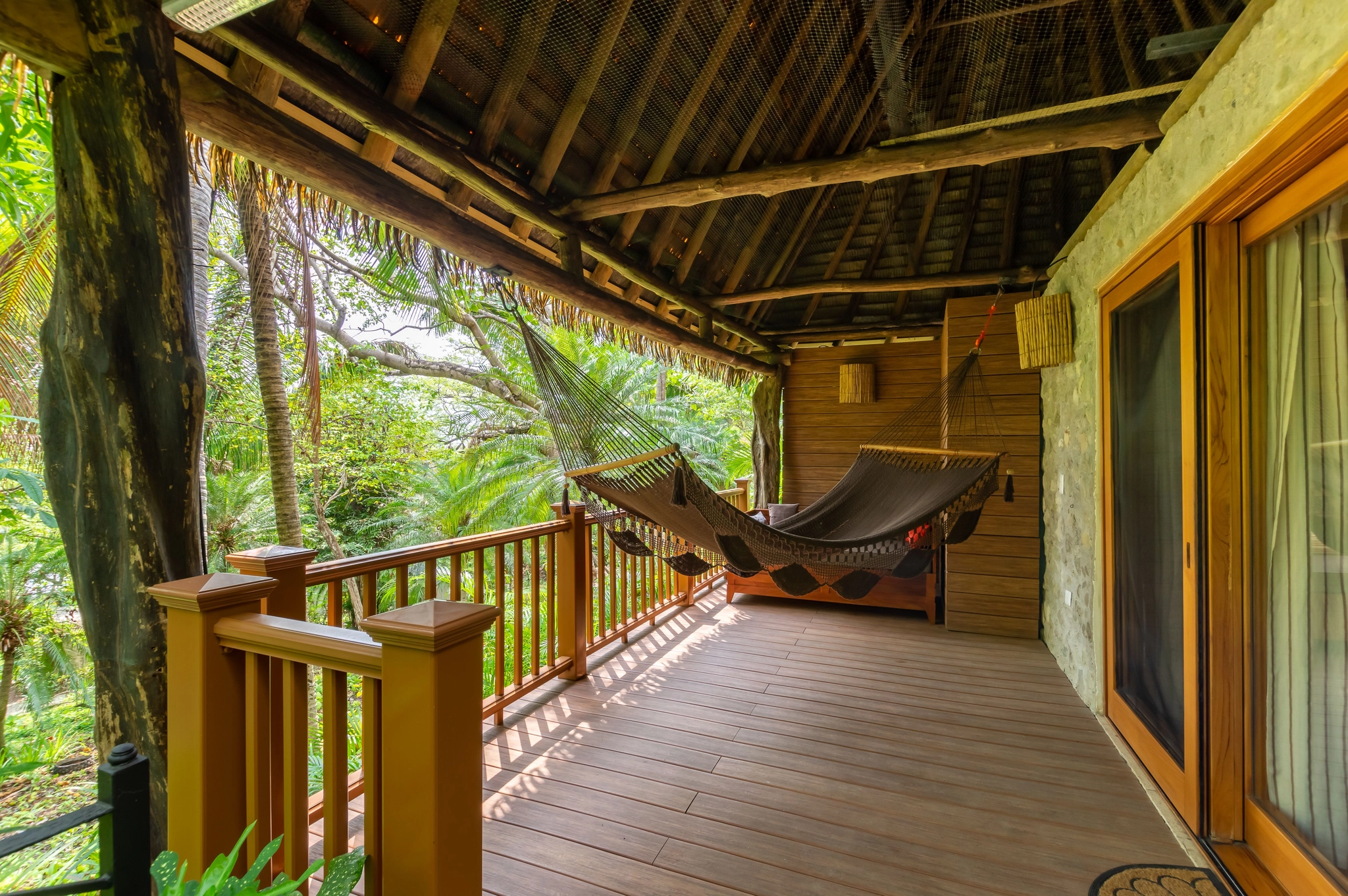 These beautiful and rustic rooms have one queen-size bed for a single person or couple, a full ensuite bathroom with an outdoor shower, air conditioning, an overhead fan, and a private porch with a hammock.