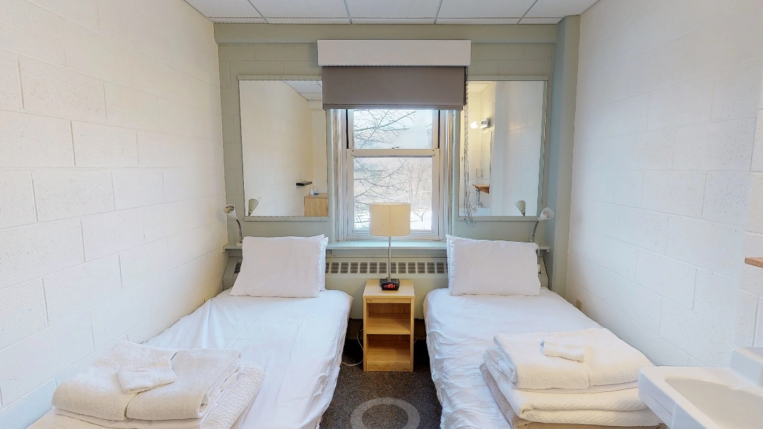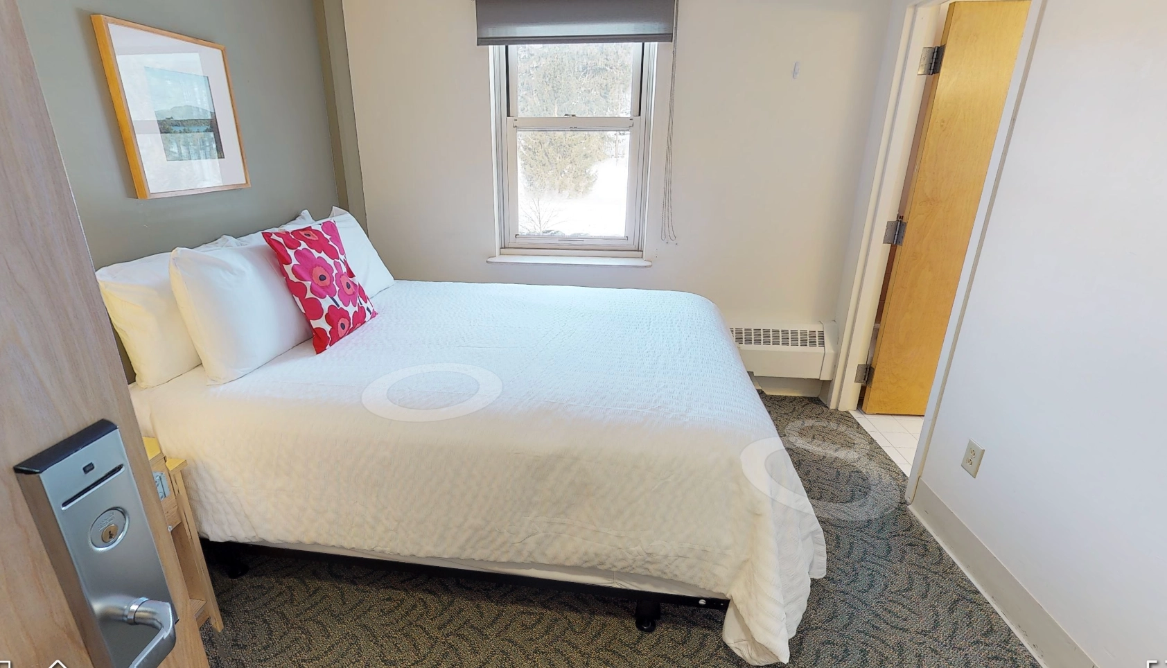 A queen bed in a private, simple dorm-style room designed for a minimalist, distraction-free retreat experience. Bathrooms are shared and located in the hall. Each room includes access to a shared hallway bathroom and an in-room safe. Note: the image below shows two twins, but the actual room is one queen.