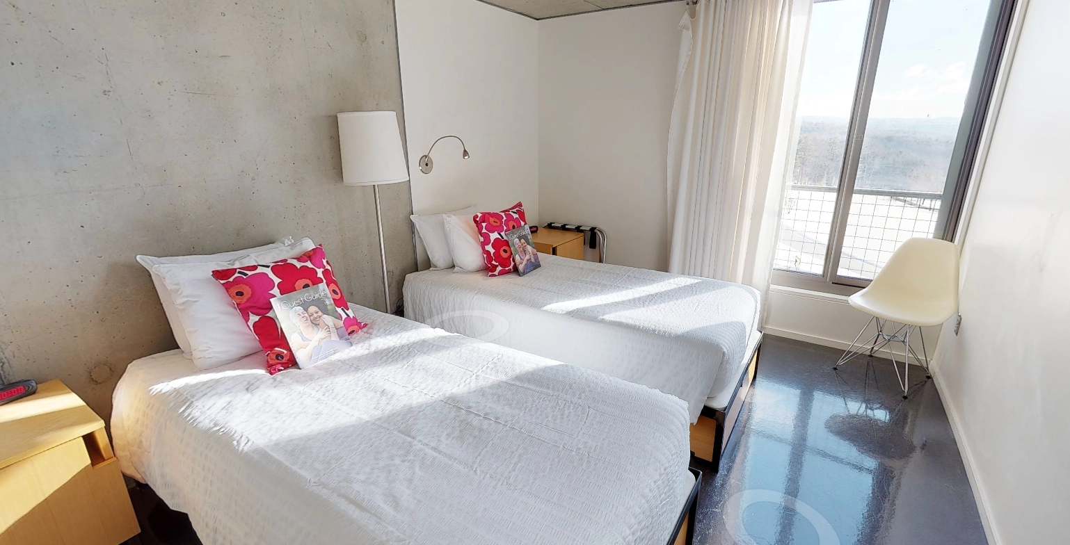 It’s a hotel-style room with a queen bed, a private bathroom, and scenic views for a more luxurious retreat. Located in the eco-friendly Annex building. These rooms feature air conditioning and a private bathroom. Each Annex room includes an in-room safe. Note: the image below shows two twins, but the actual room is one queen.
